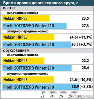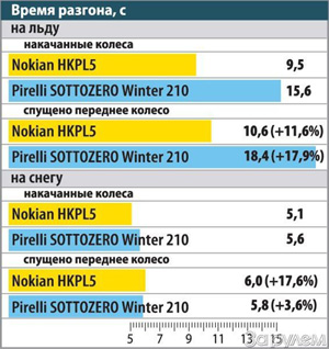 В разгоне на льду «трехколесного» варианта «Нокиан» проигрывает сама себе 11,6%, а «Пирелли» – в полтора раза больше (17,9%). В торможении проигрыш «шипов» составляет 3,2 м, а «нешипы» «привозят» заметно меньше – лишь 1,1 м.